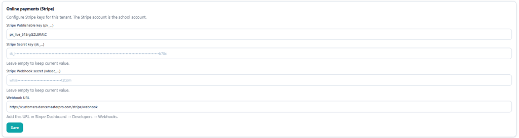This module enables your academy to accept online payments via Stripe. Follow these steps to integrate Stripe with Dance Master Pro.