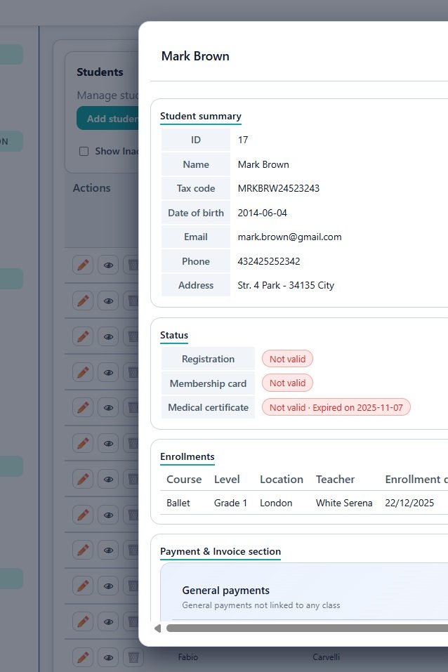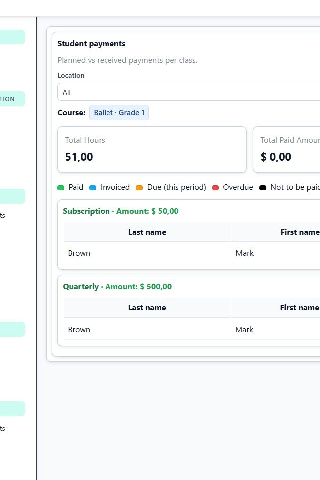 Students, Courses and Events Scheduling, Payments and Invoicing