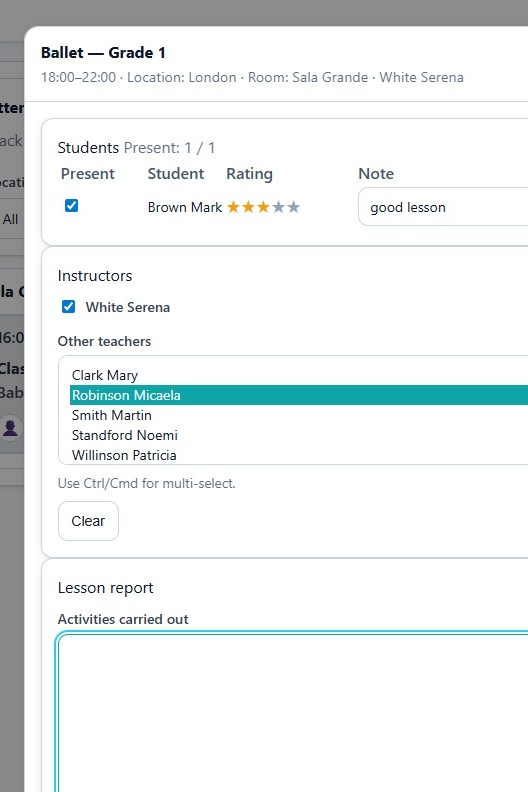 Easily manage attendance by checking in students and providing ratings and comments for each lesson, ensuring accurate tracking.