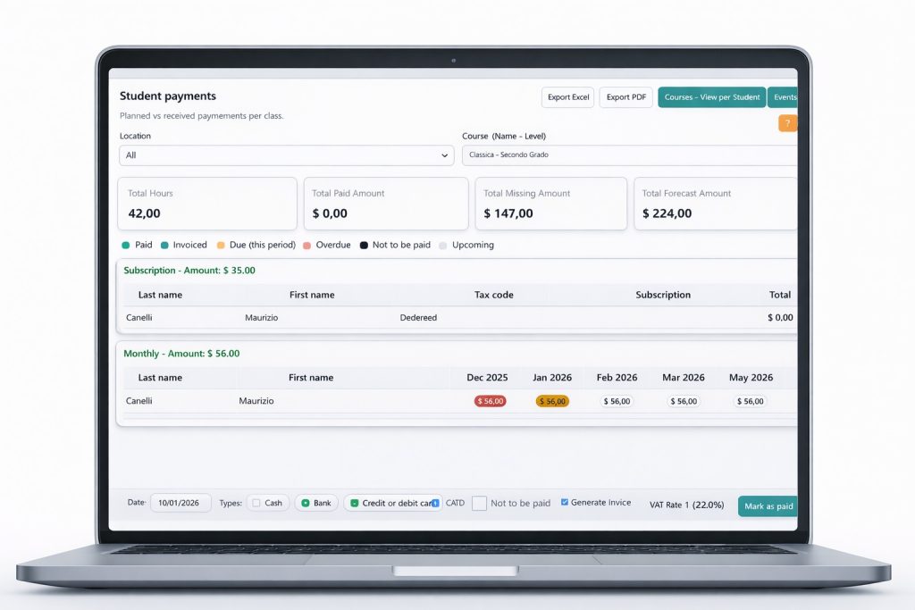 Track payment status, generate automatic reminders and send summaries of due fees. Add detailed descriptions, taxes, discounts and payment terms.